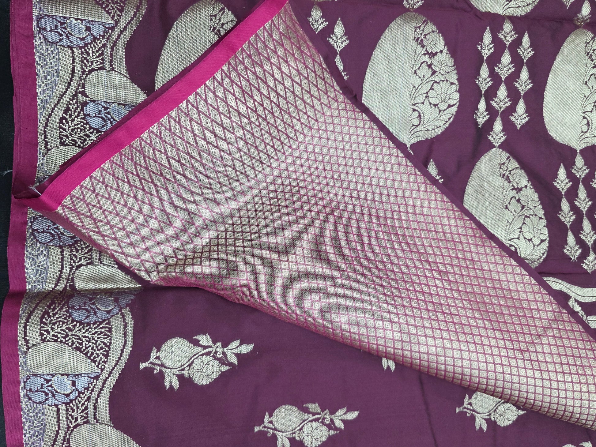 This stylish and elegant Maroon Banarasi Katan Saree is made of lightweight silk and features intricate zari work. Perfect for any occasion, this saree is available at a special offer price. Elevate your wardrobe with this beautiful piece.