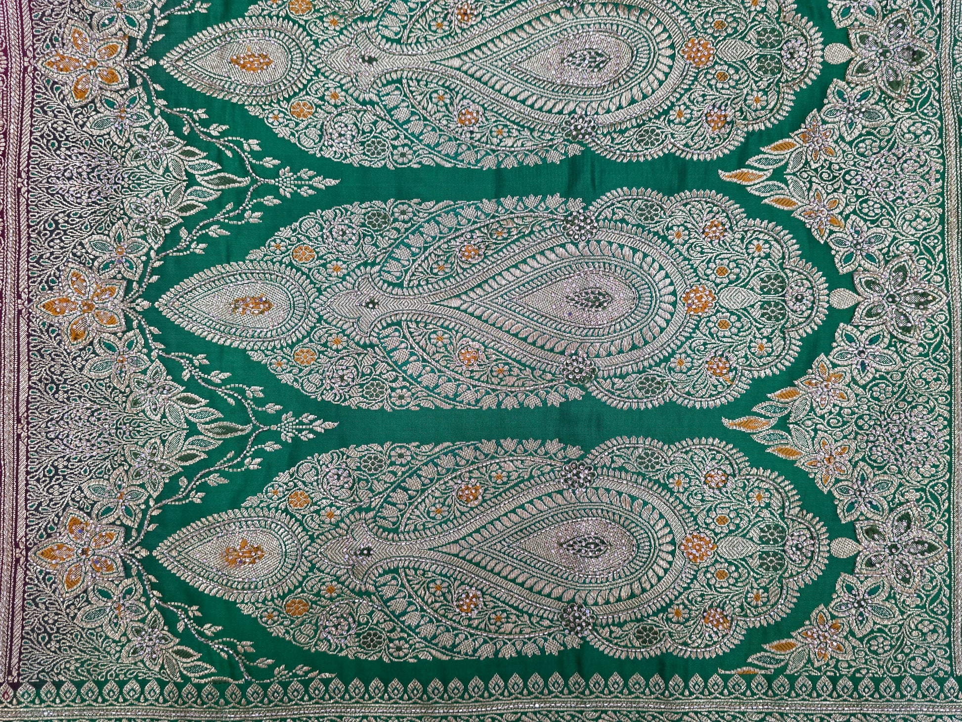 This cheerful Maroon and green Banarasi Katan silk saree features lovely katdana, sparkling Swarovski accents, and gentle hand brush work. It’s a perfect pick for festive occasions, bringing warmth and elegance to your special moments.