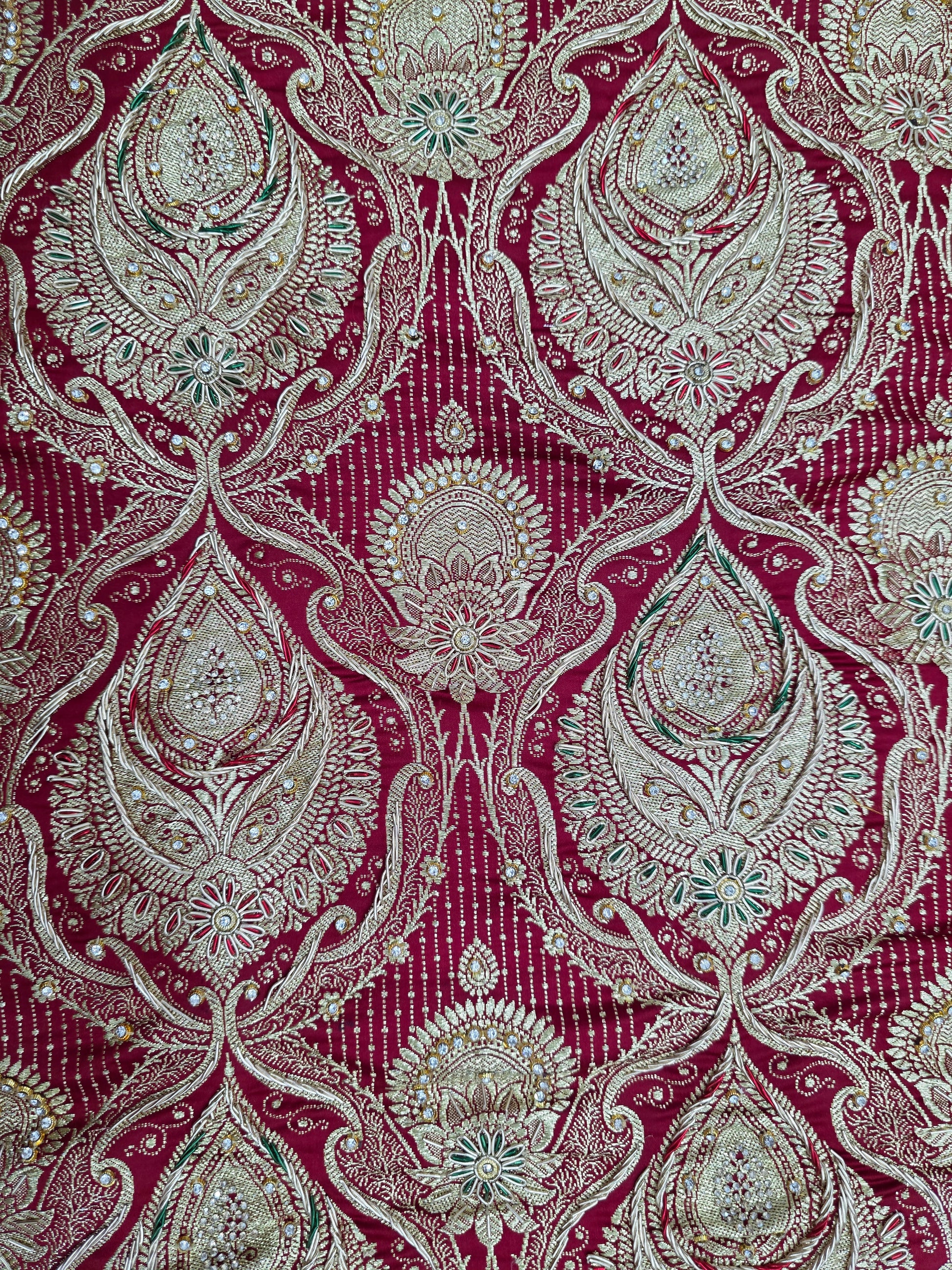This stunning Maroon Zardozi Zarkan Banarasi Katan Saree features intricate heavy zarkan Zardozi work on high-quality banarasi katan silk. Perfect for any special occasion, especially for brides. Elevate your style with this classic and elegant saree.