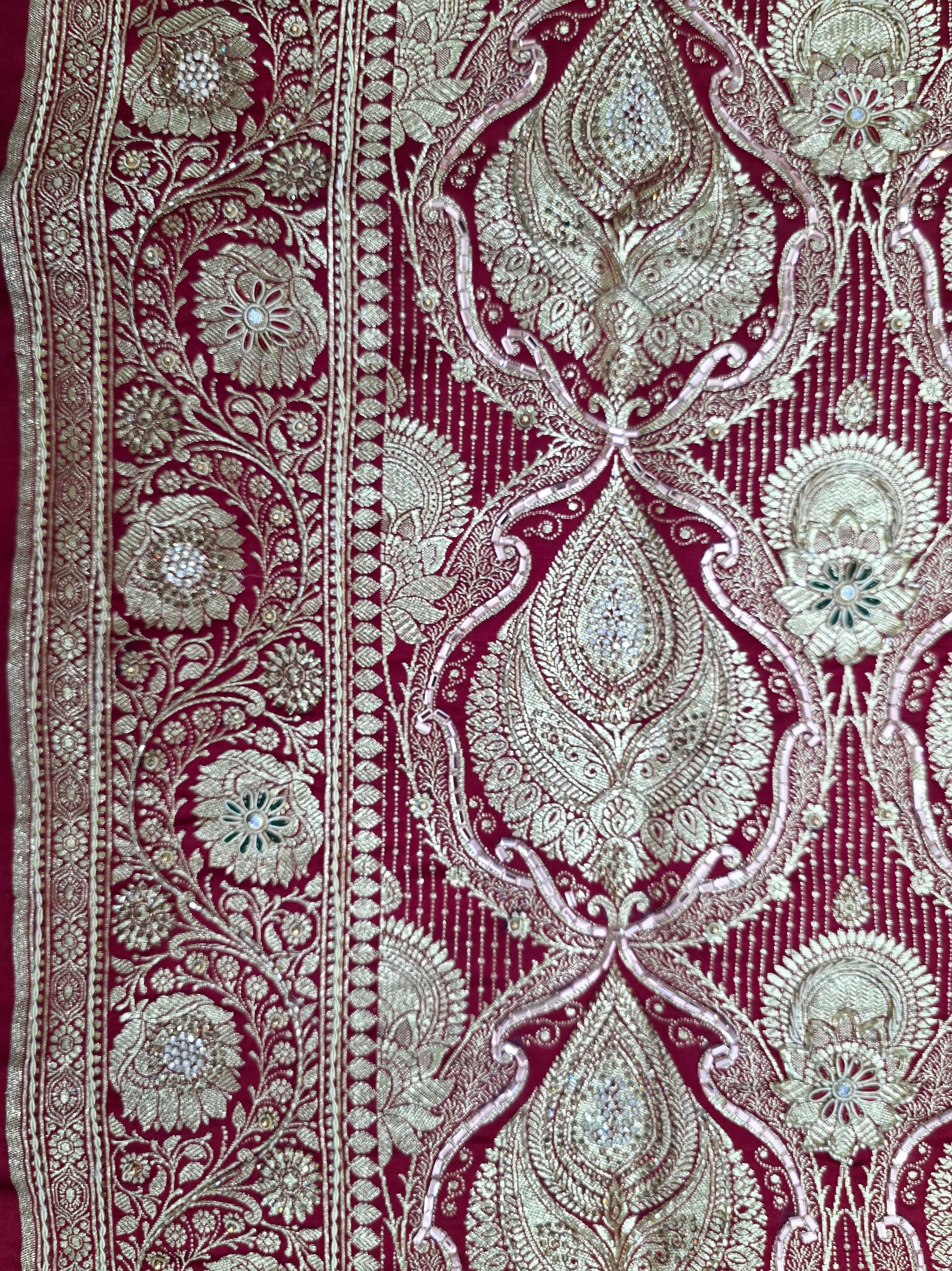Maroon Zardozi Zarkan Banarasi Katan Saree