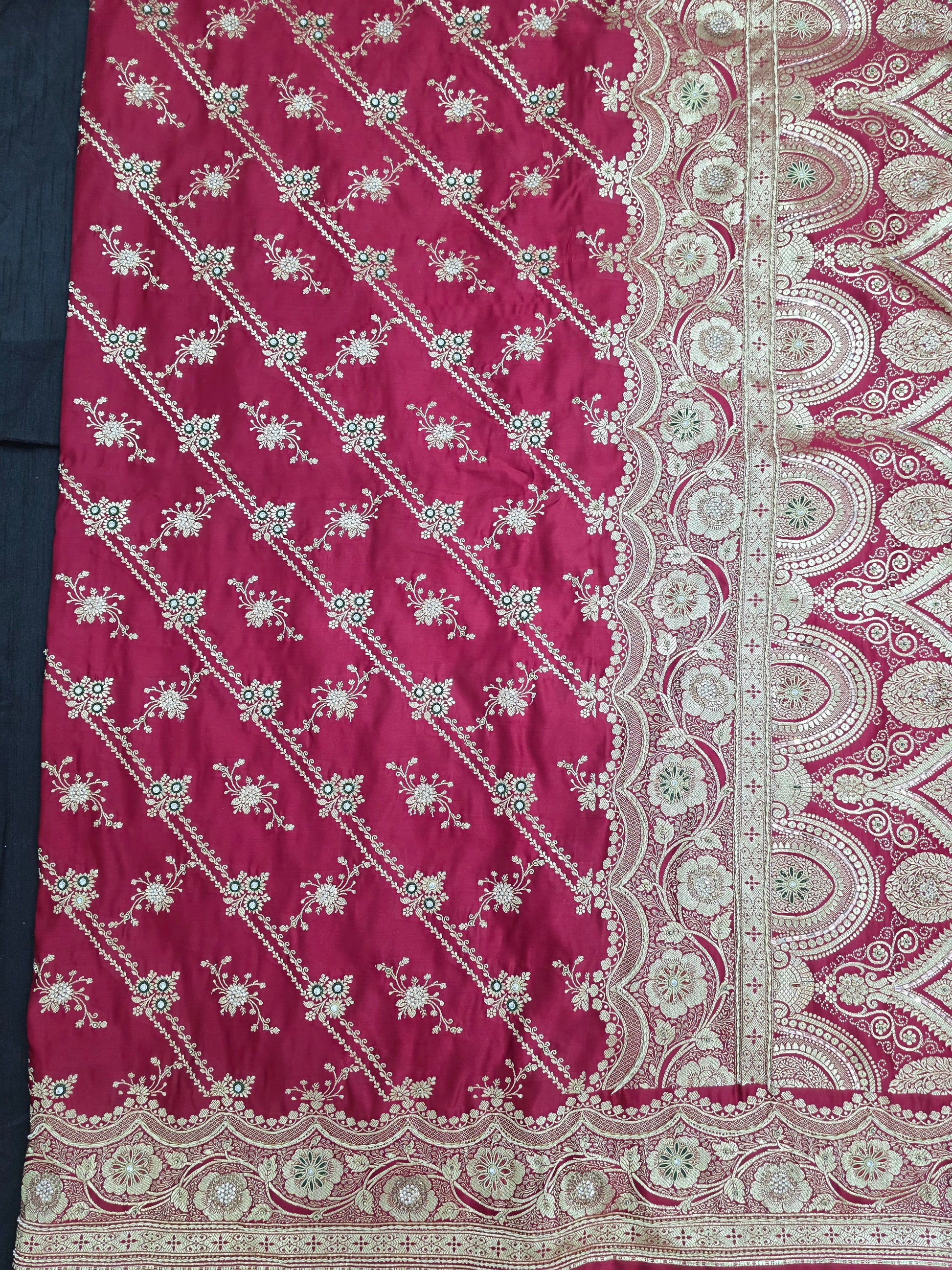 "Add a touch of elegance to your special day with our Maroon Zardozi Zarkan Banarasi Katan Saree. Made with luxurious katan silk and adorned with stunning zarkan zardozi and Swarovski, this heavy Dulhan saree will make you feel like a royal bride."