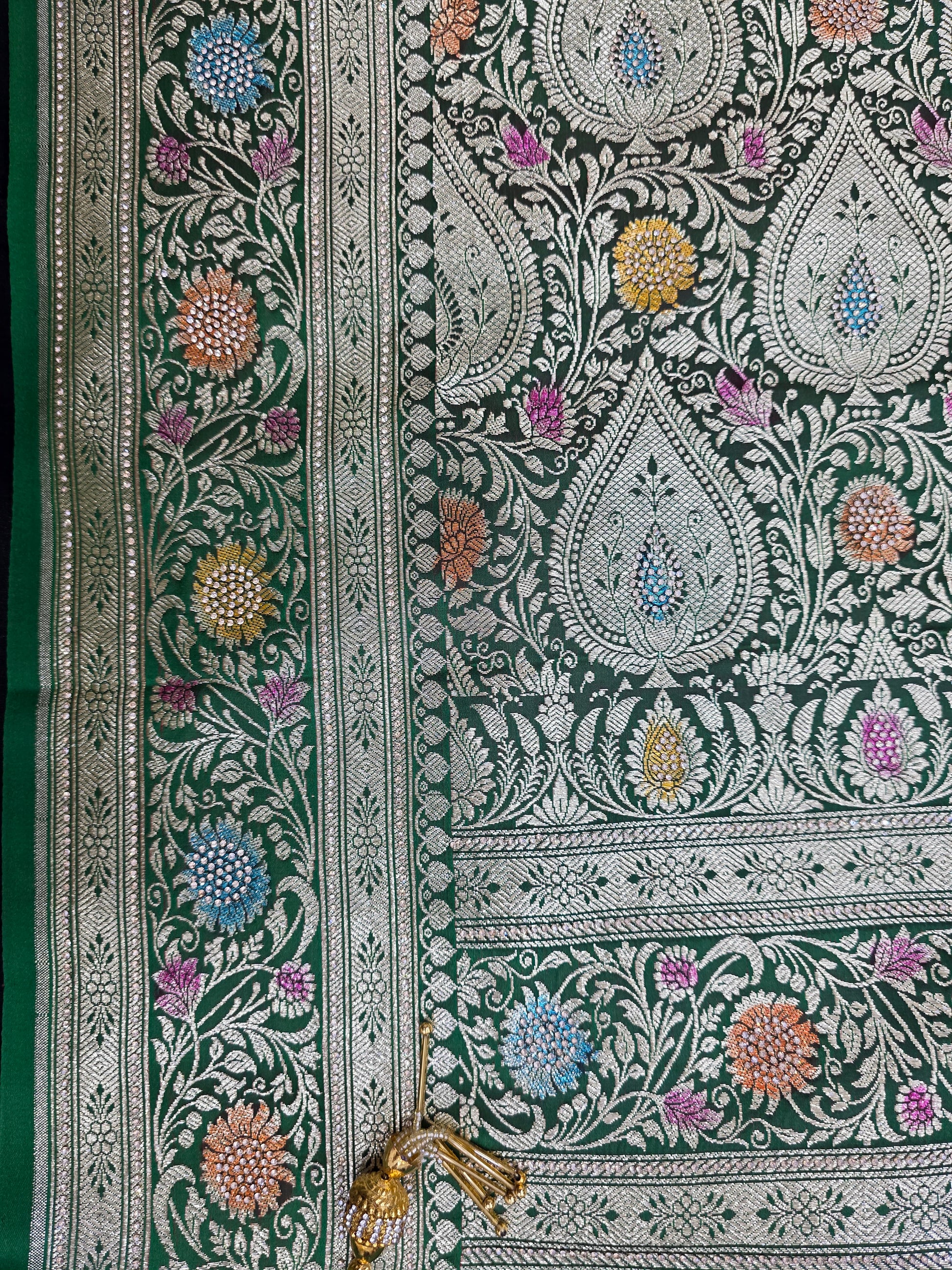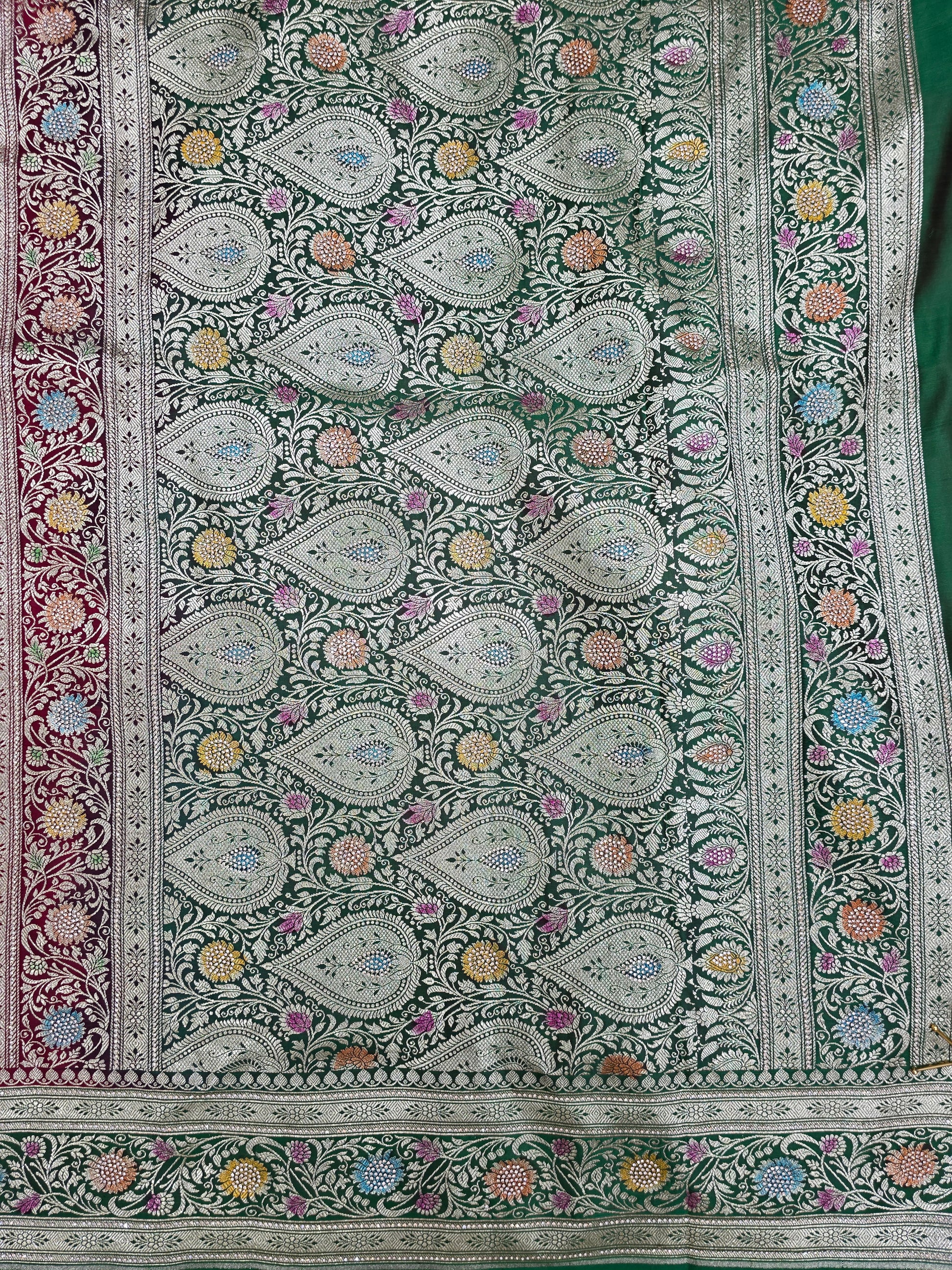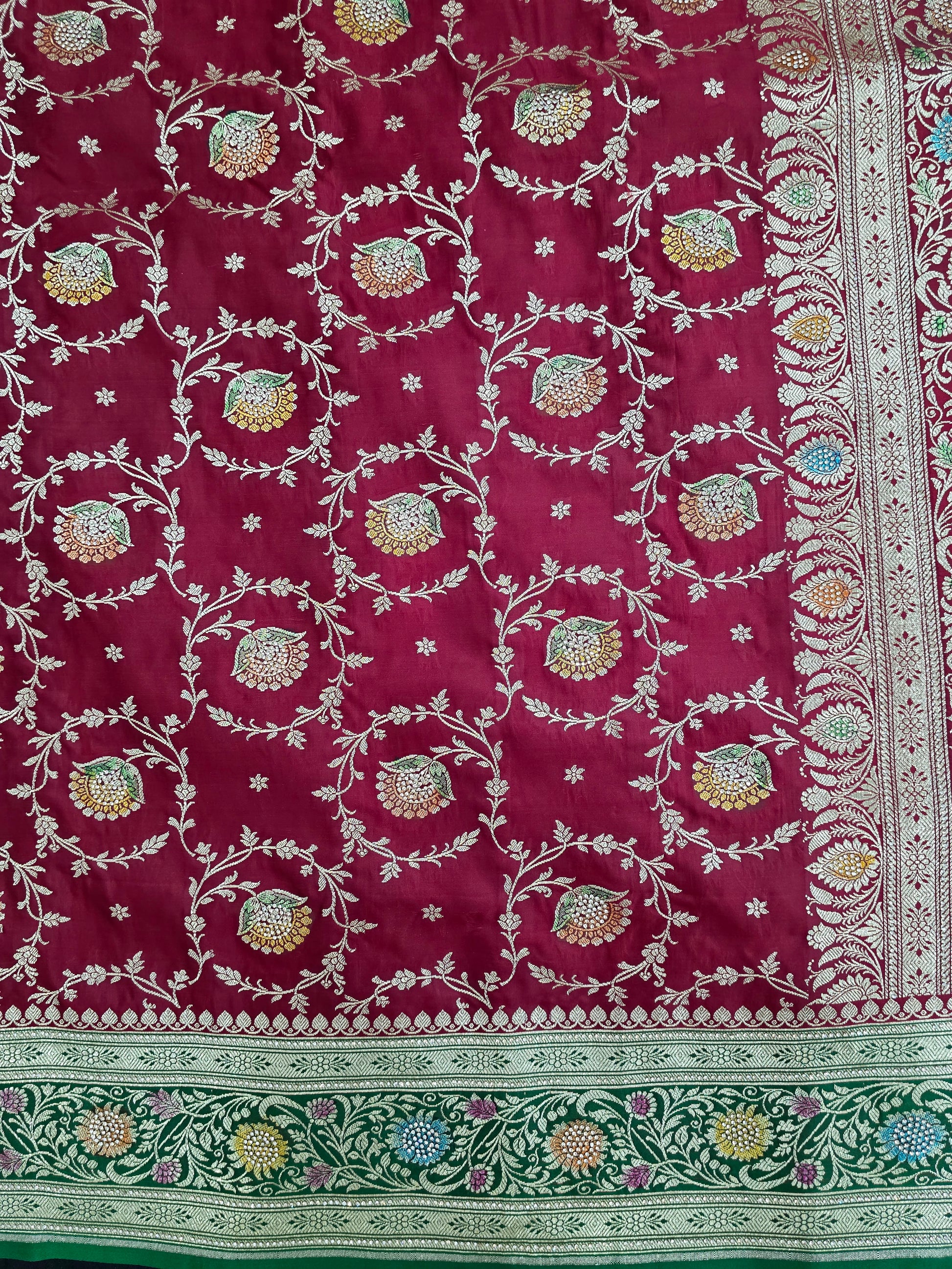 Elevate your festive look with the Wine Zarkan Banarasi Katan Saree. Made from luxurious katan silk with intricate zarkan work, this saree is perfect for parties and celebrations. The combination of Maroon and green adds a touch of elegance.