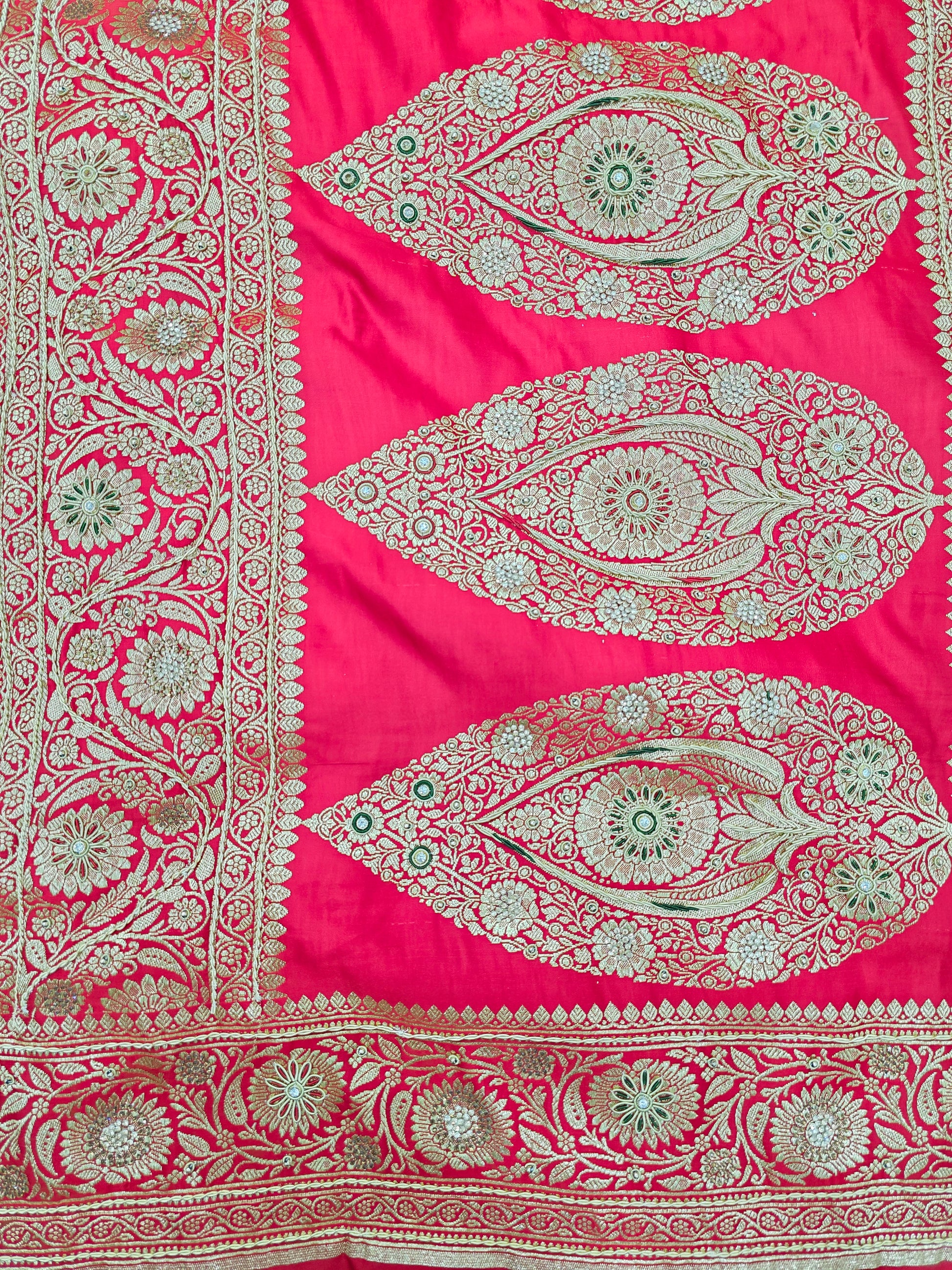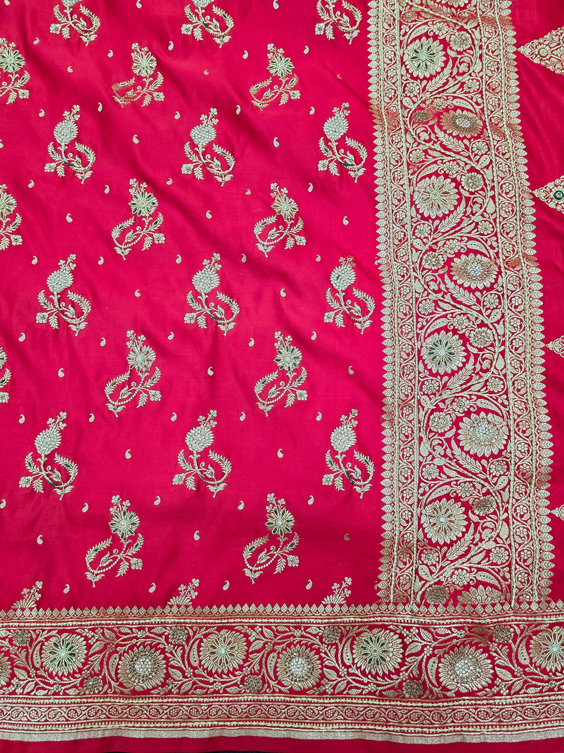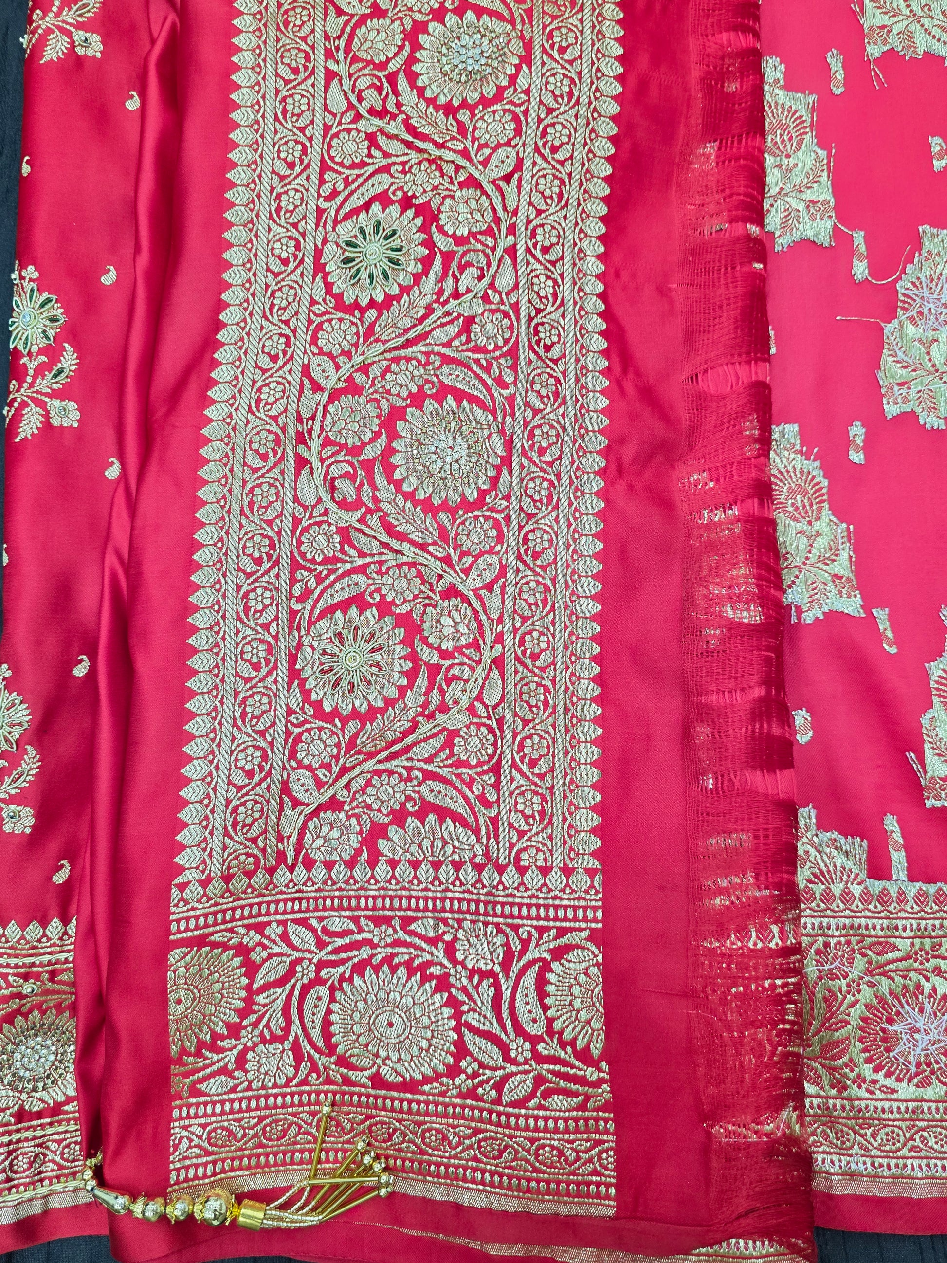 Get ready to dazzle in this exquisite Red Zardozi Zarkan Banarasi Katan Saree! The heavy zardozi, zarkan, and Swarovski work add a touch of elegance to this Banarasi katan silk saree. A perfect choice for brides and at a wholesale price, this saree is a must-have for any special occasion.