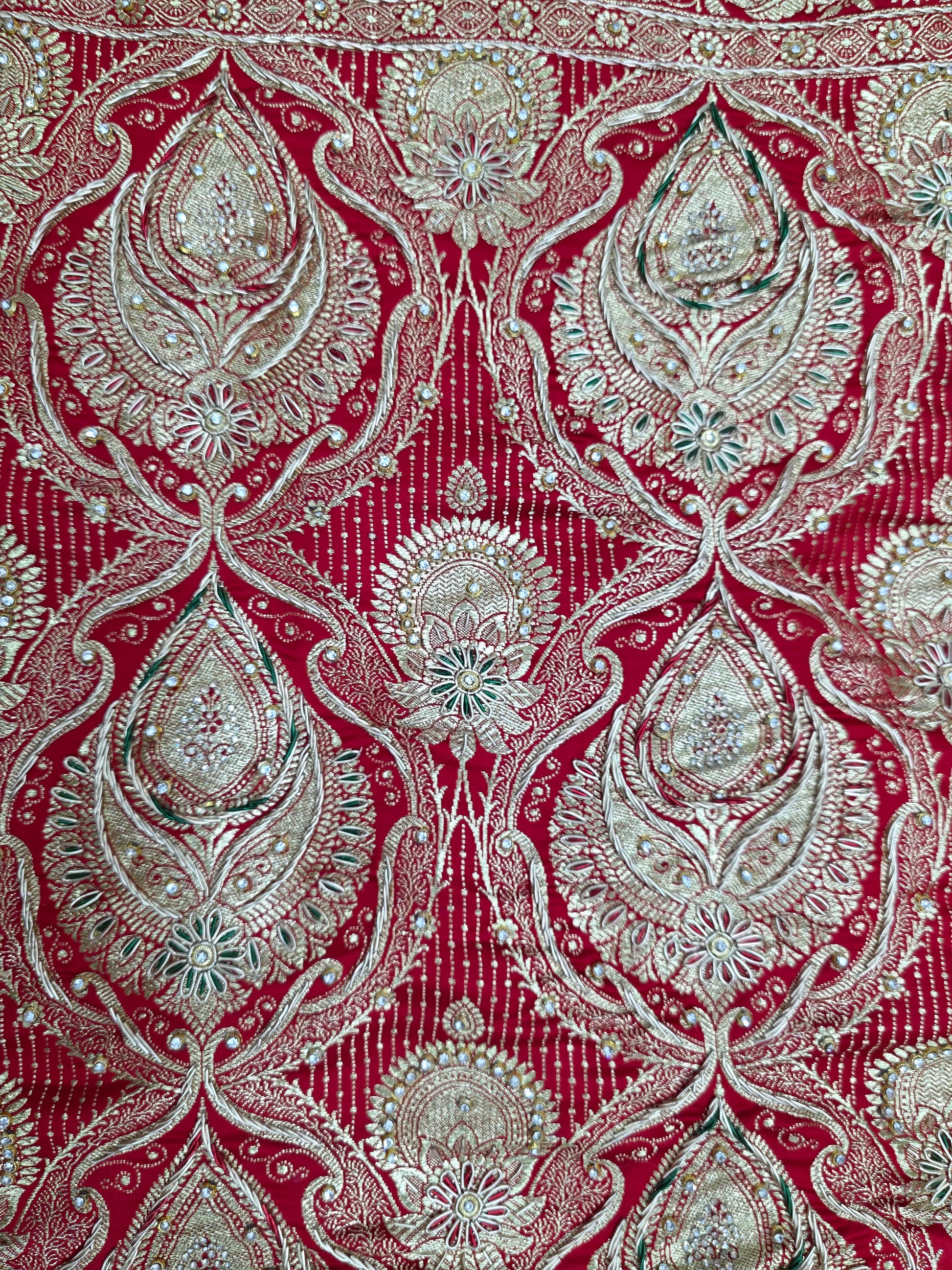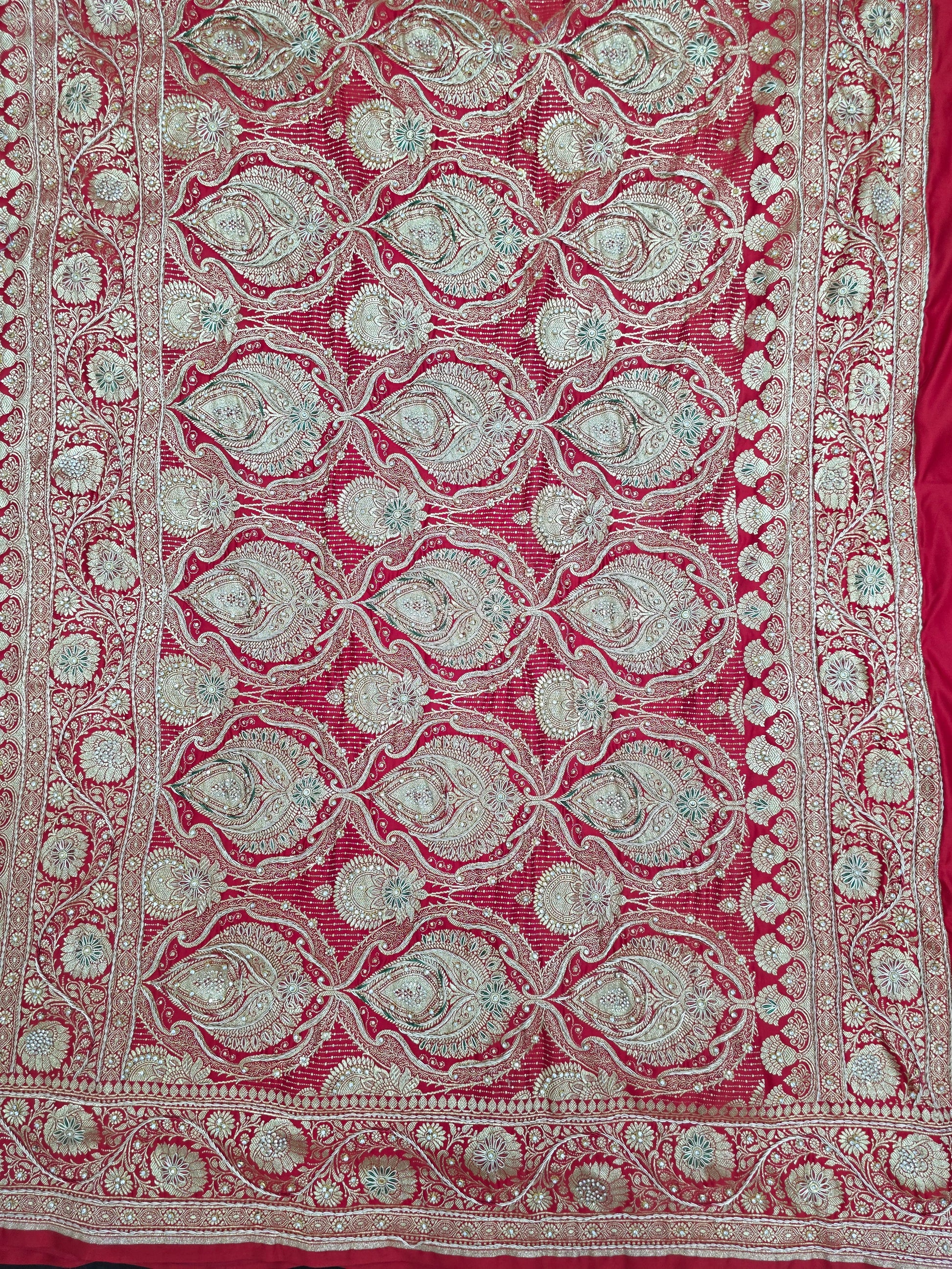 This stunning Red Zardozi Zarkan Banarasi Katan Saree features intricate heavy zarkan Zardozi work on high-quality banarasi katan silk. Perfect for any special occasion, especially for brides. Elevate your style with this classic and elegant saree.