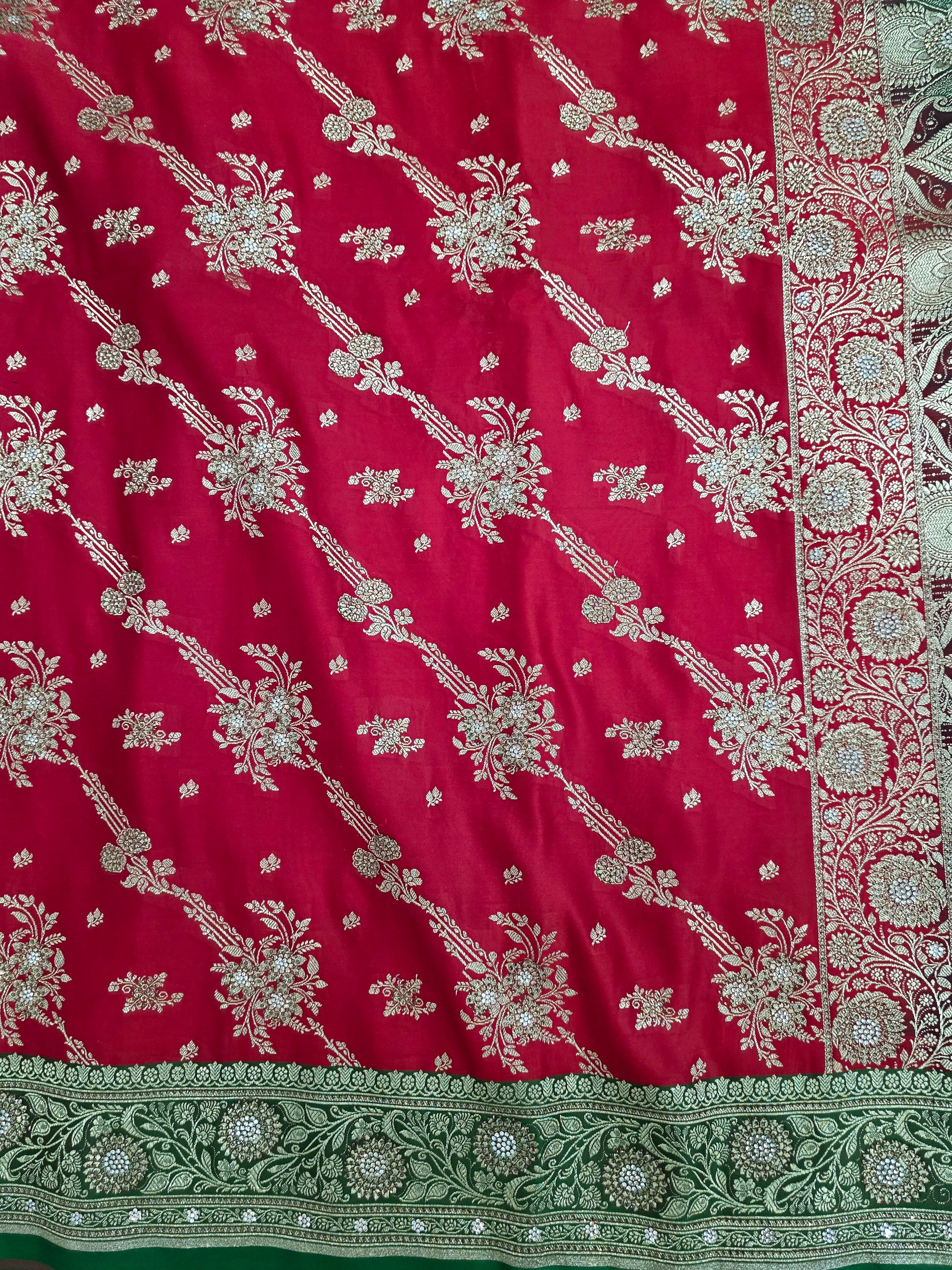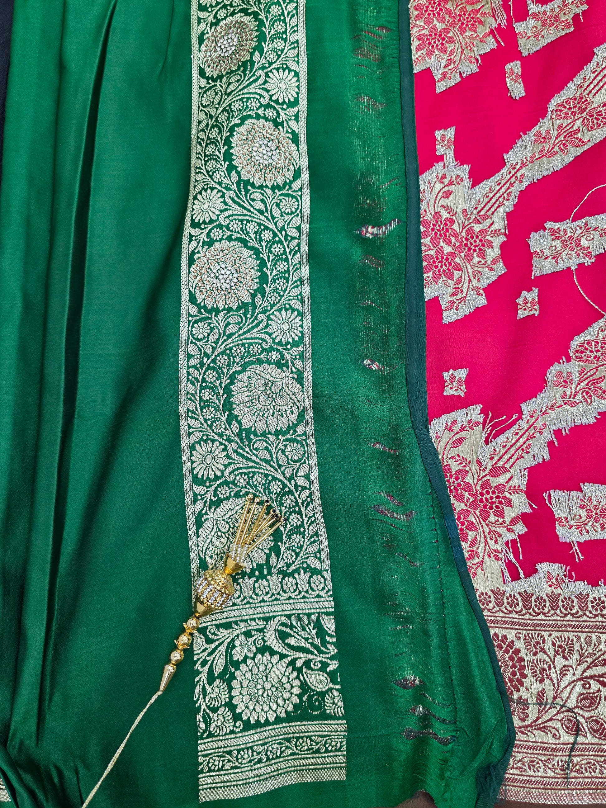 "Shine bright in our Red and green Zarkan Swarovski Banarasi Katan Saree. Made with luxurious Banarasi katan silk and adorned with intricate Swarovski zarkan work, this saree is perfect for any party or special occasion. Add a pop of vibrant color to your wardrobe with this must-have piece."