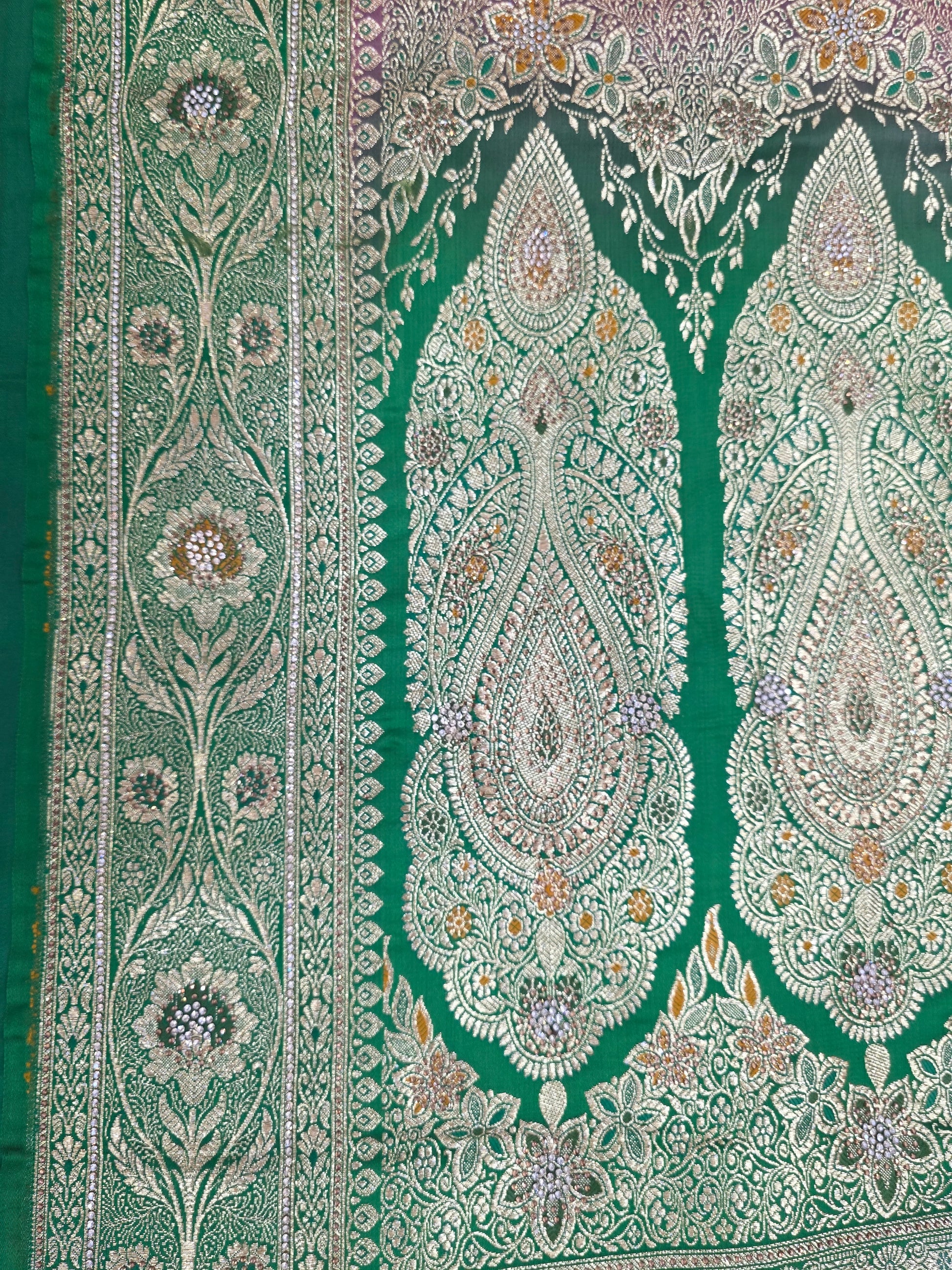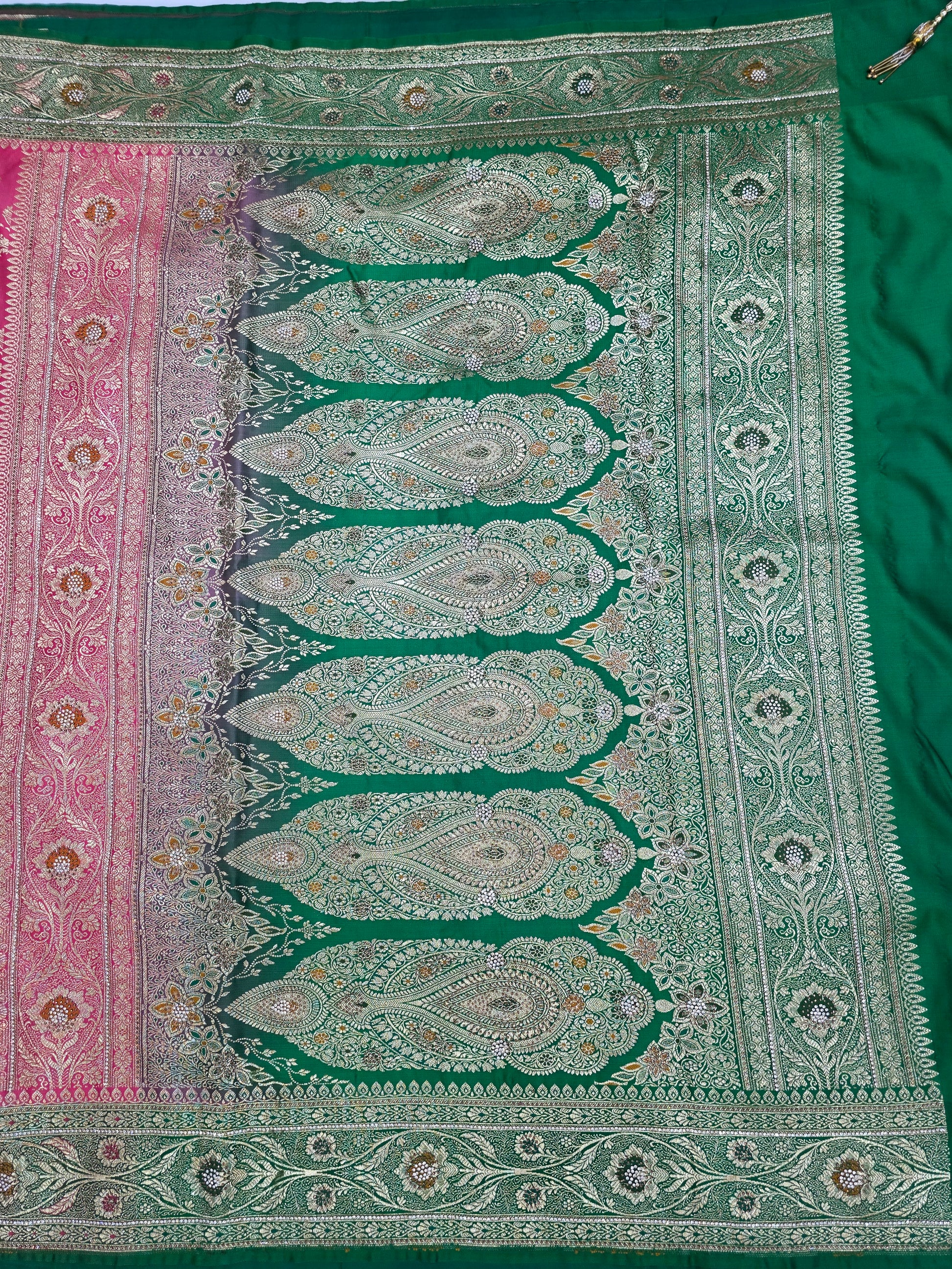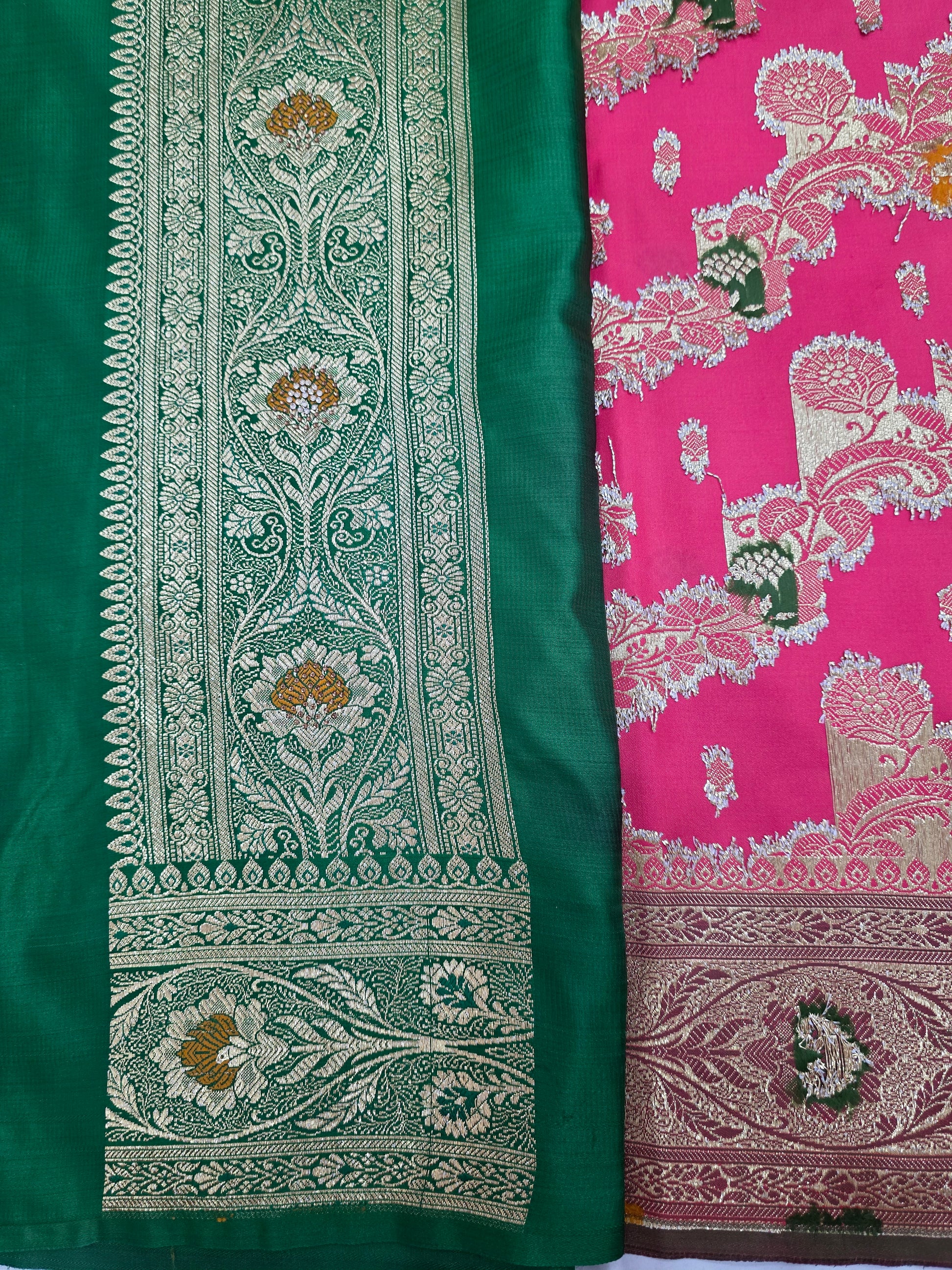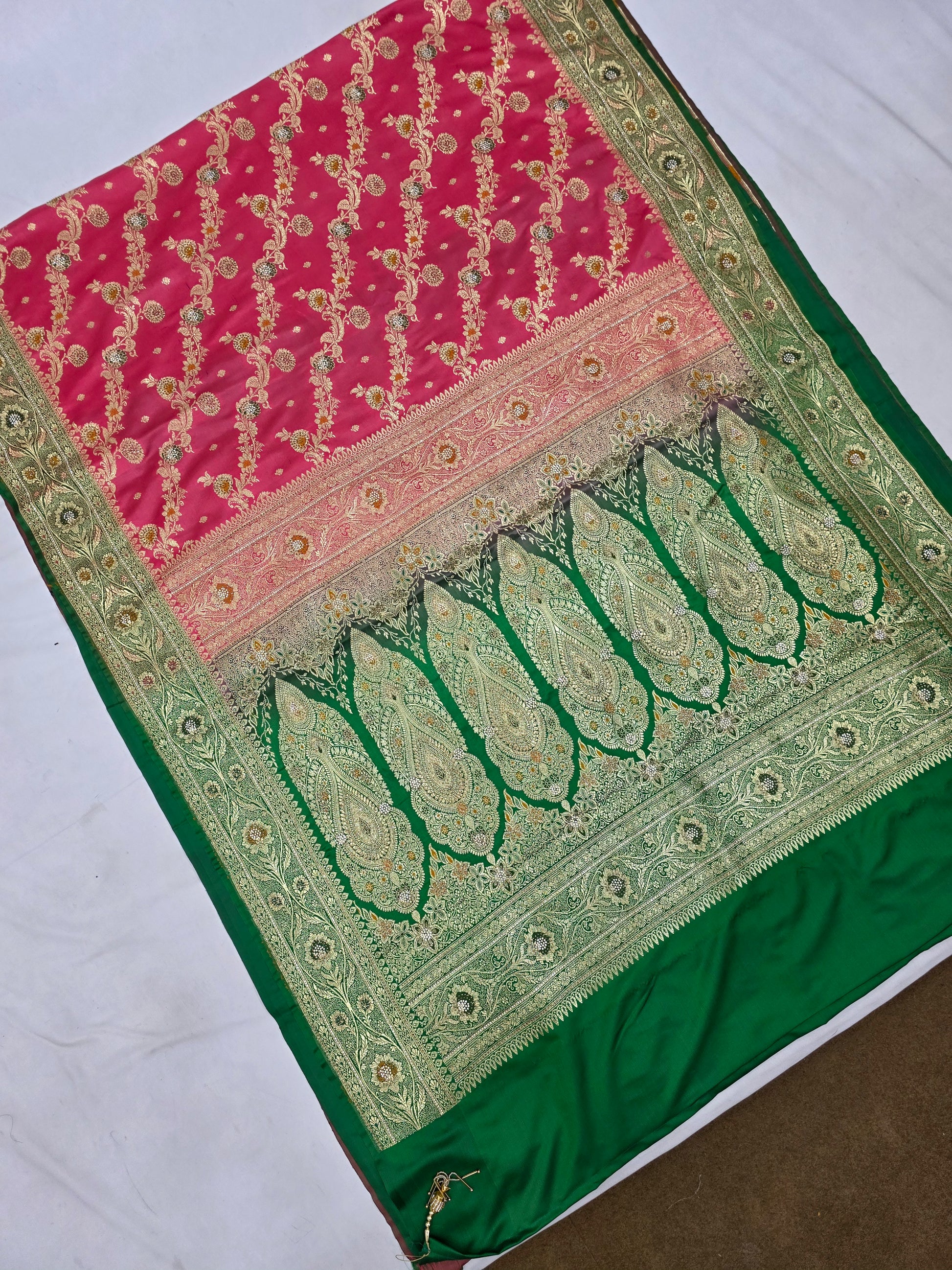 This strawberry Zarkan Swarovski Banarasi katan saree is a beautiful choice. Made with banarsi katan silk, it features a stunning strawberry and green combination. The Zarkan Swarovski Meena kari work adds a touch of elegance. Perfect for special occasions.