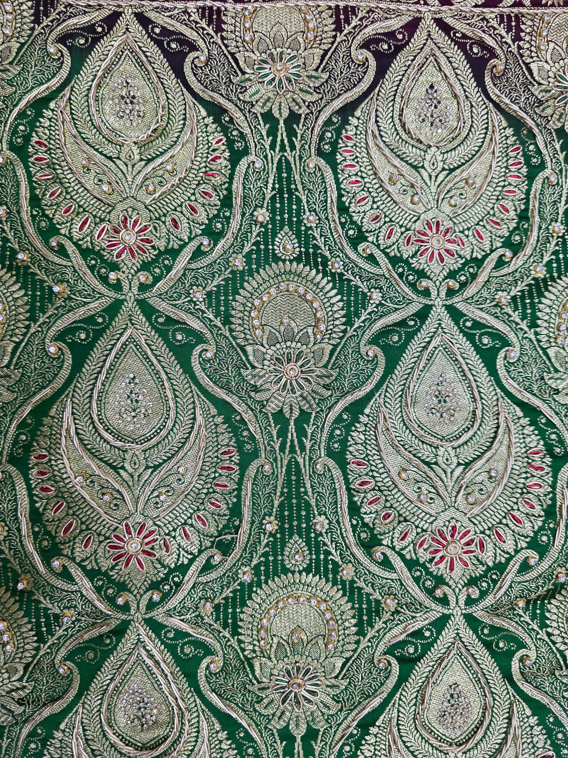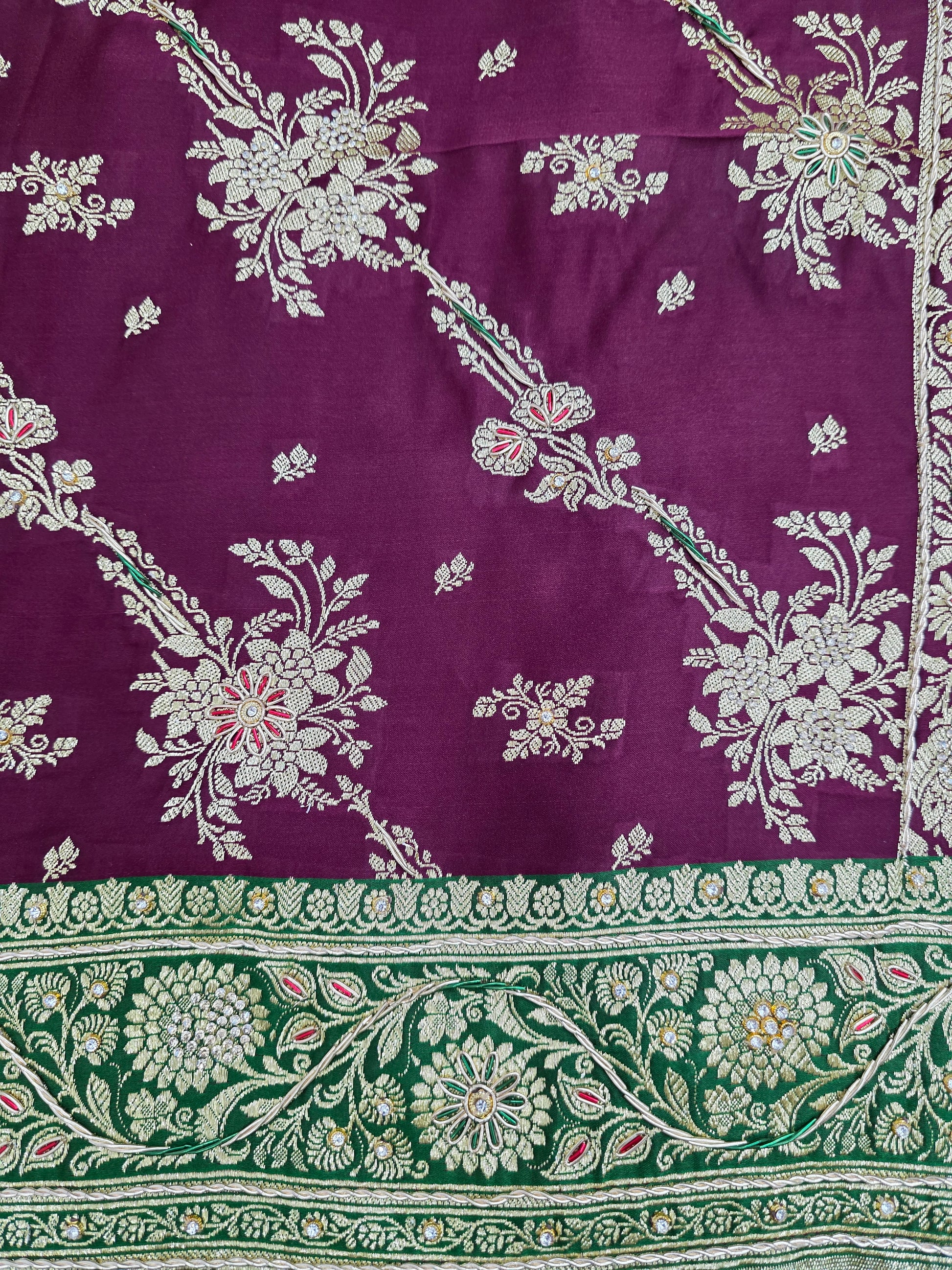 Get ready to turn heads in this stunning Wine Zardozi Zarkan Banarasi Katan Saree. Made from luxurious Banarasi katan silk, this saree boasts heavy zarkan Zardozi work in Wine and green, making it the perfect choice for your next party or even as a dulhan saree. Order now!