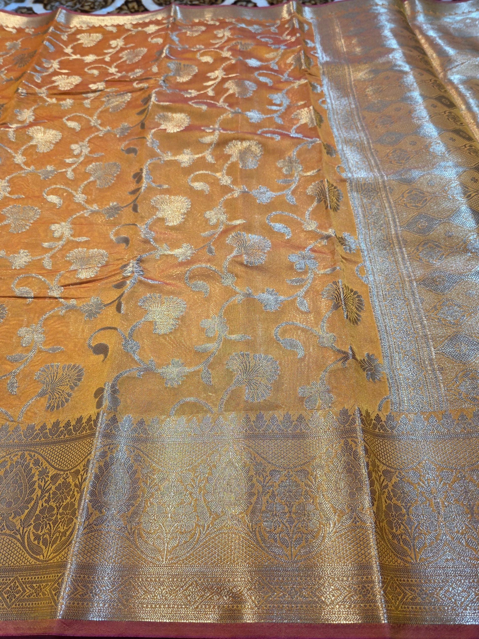 This Yellow Banarasi Saree is crafted with luxurious silk and adorned with heavy zari weaving. The vibrant yellow color and intricate jaalwork create a stunning traditional look. Elevate your style and stand out at any occasion with this beautiful saree.