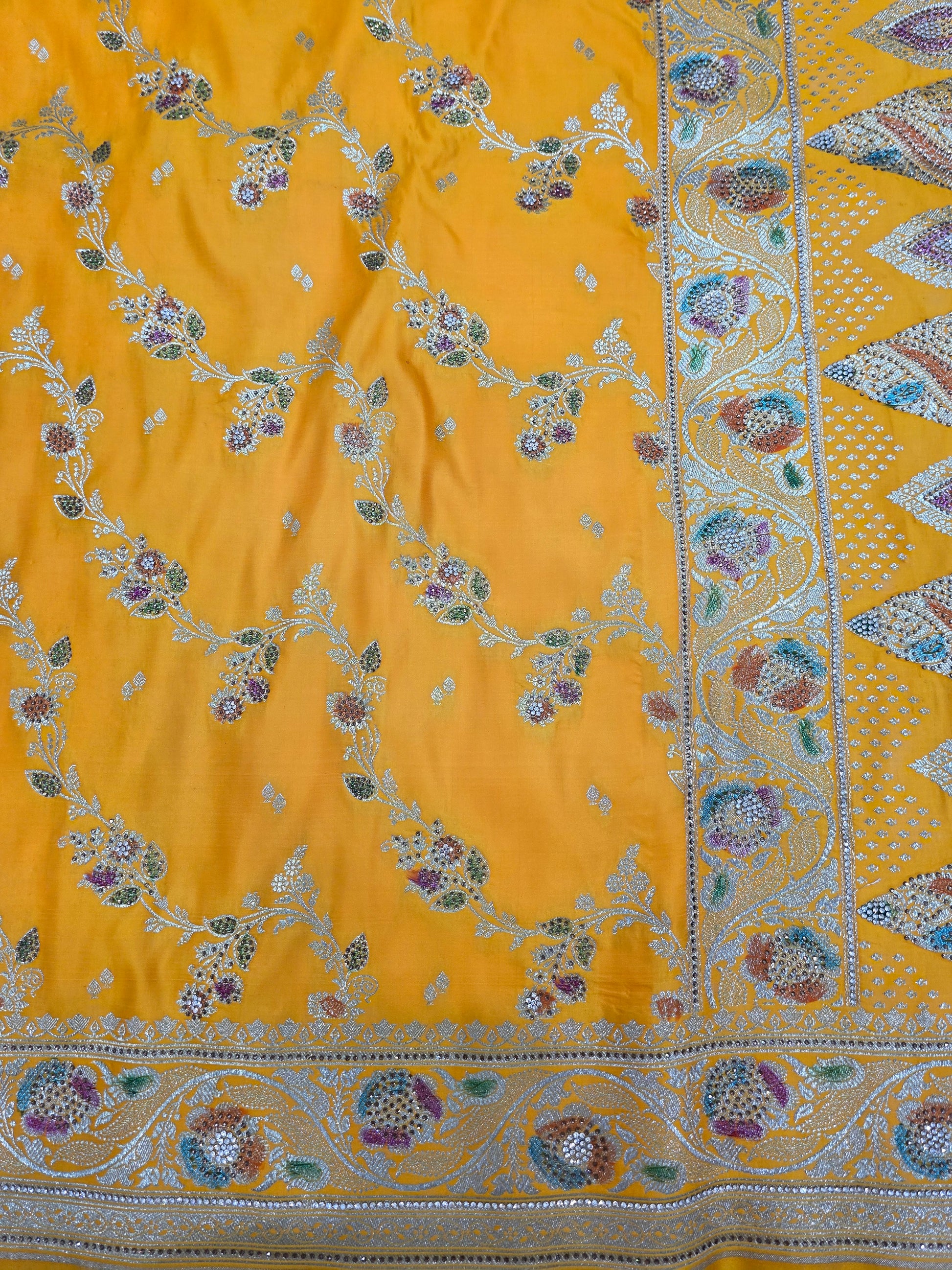 Yellow Zarkan Swarovski Banarsi Katan Saree